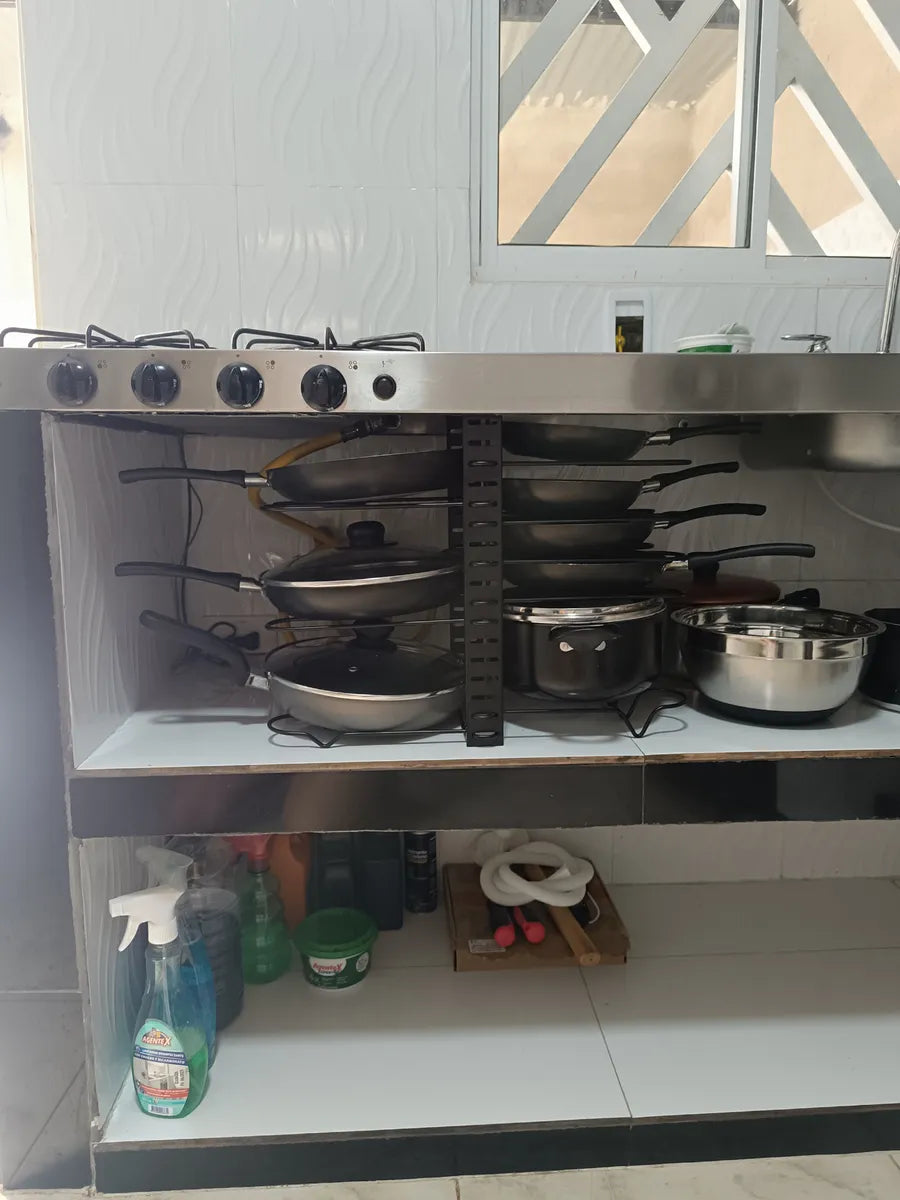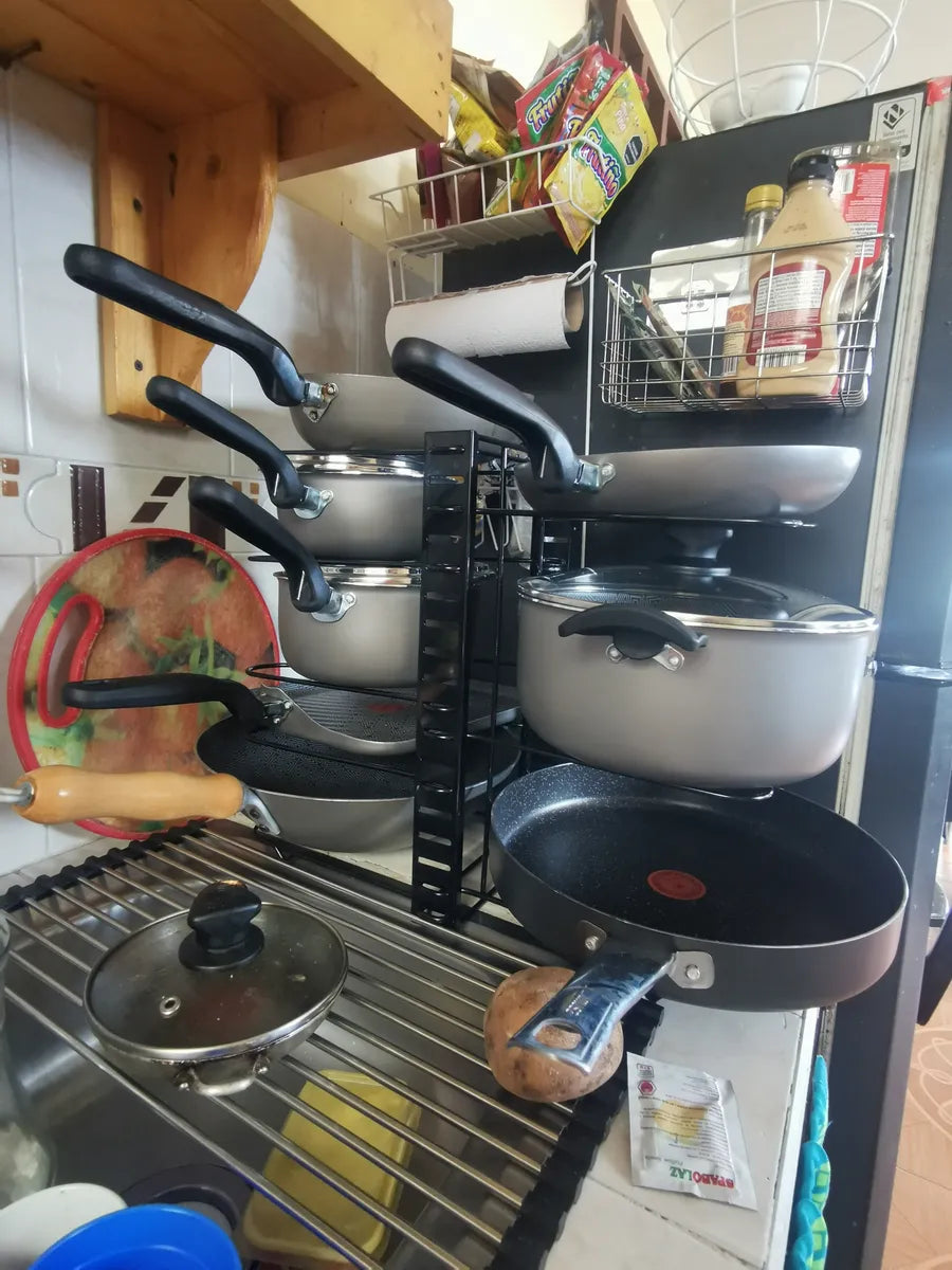 Con este organizador metálico de 8 niveles ajustables, cada olla tiene su lugar, se mantiene protegida y siempre a la vista, haciendo tu cocina más práctica desde el primer día.